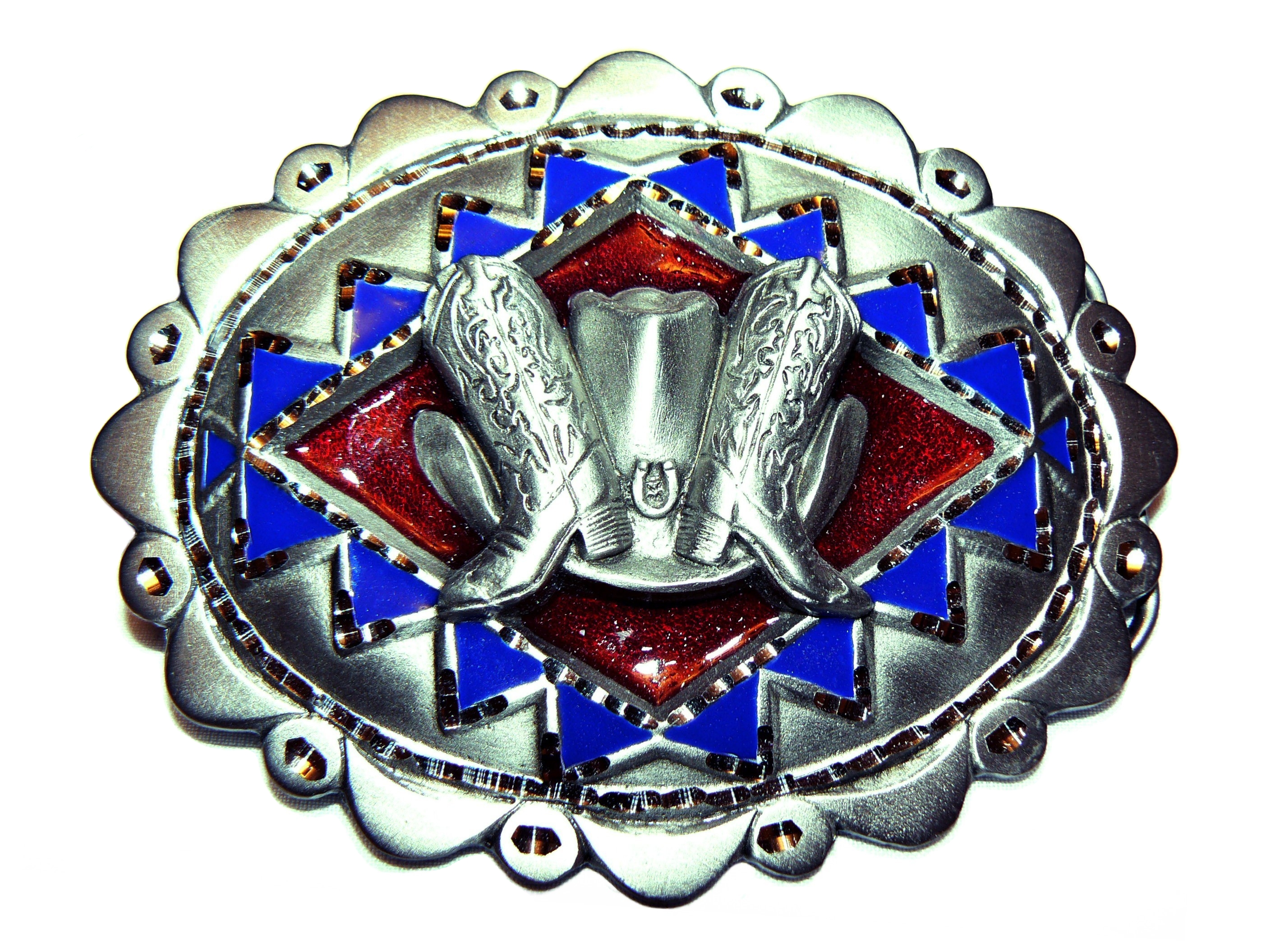 This is a high quality zinc and pewter belt buckle, hand finished in red and cobalt blue enamel. The centre motif shows a hat and a pair of cowboy boots.