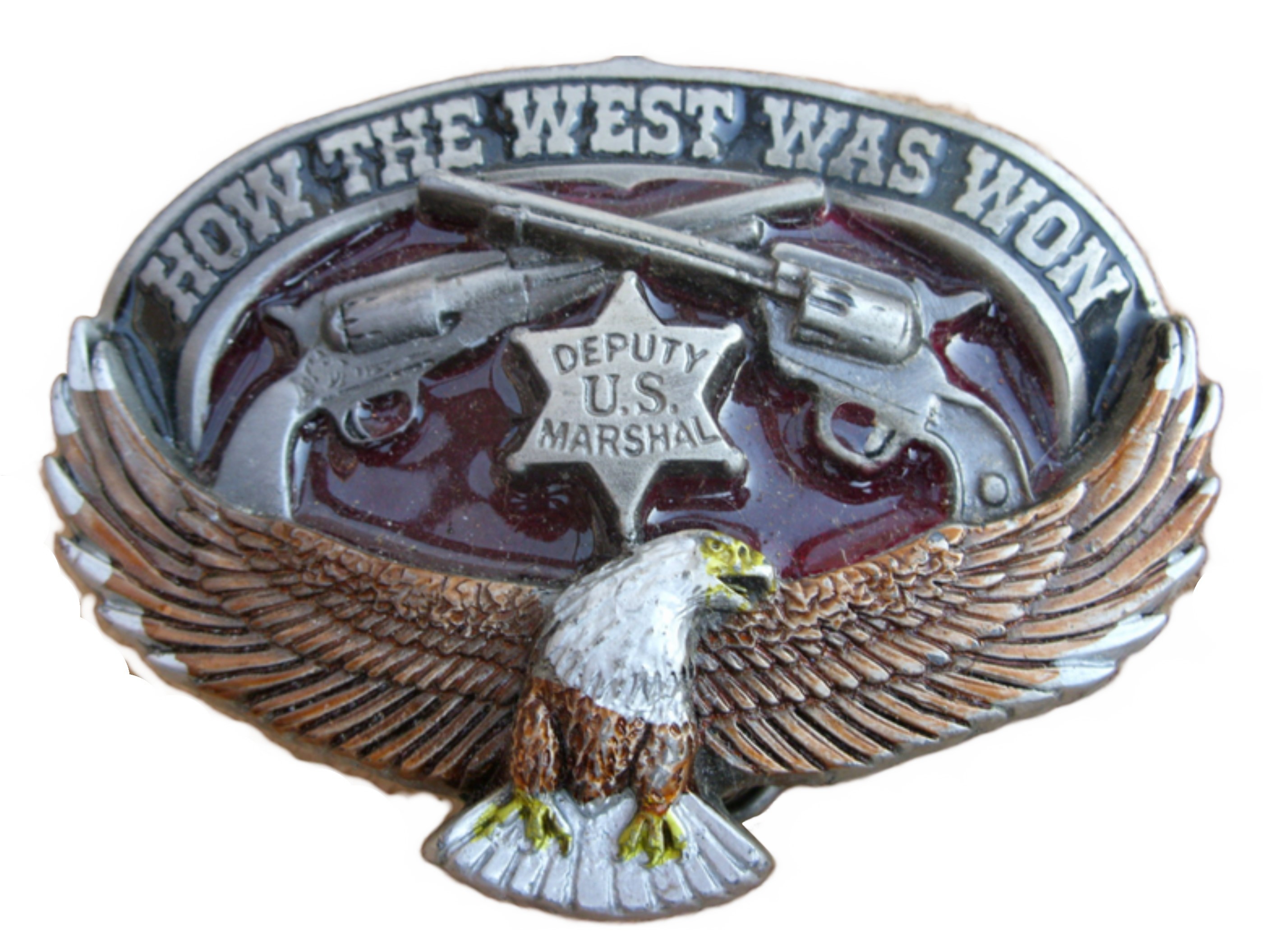 A Marshall’s badge, two revolvers and an American eagle, all depicted on this solid pewter belt buckle. Hand finished with black, deep red, yellow and bronze enamel.