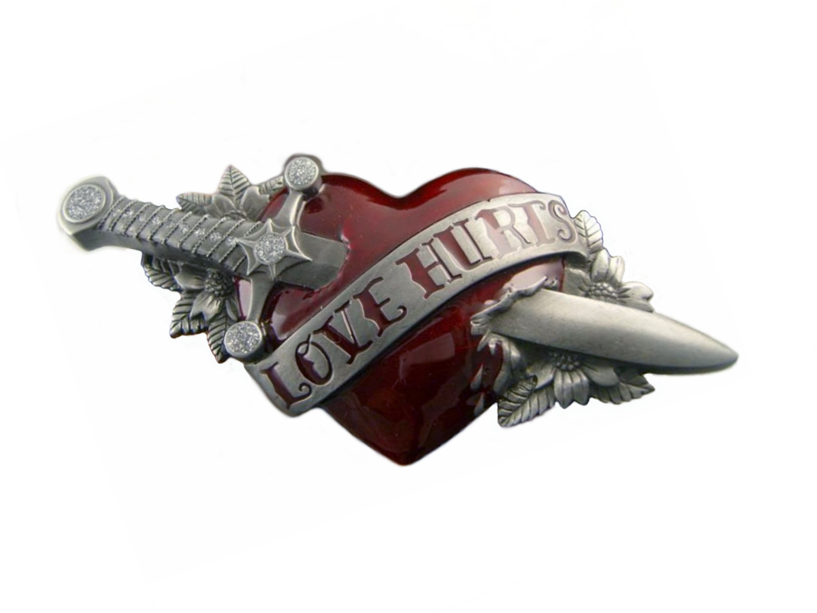 This quality solid pewter belt buckle shows a dagger piercing a heart with the words ‘Love Hurts’ written on the banner. The heart and lettering is hand finished with deep red enamel and four points on the handle of the dagger are embellished with silver glitter enamel.