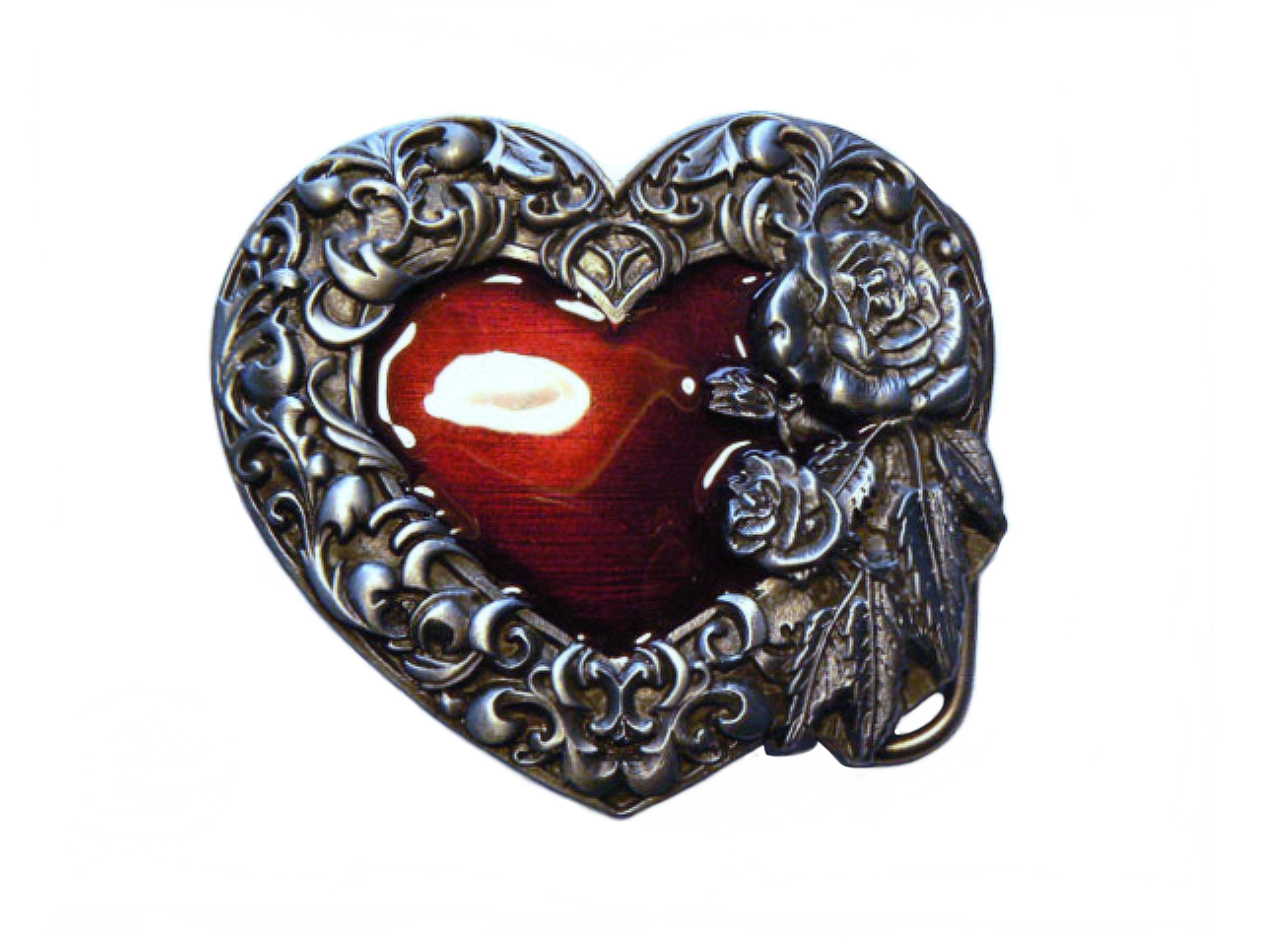 This is a beautiful and elegant solid pewter belt buckle. The heart shaped frame is decorated with deeply embossed flourishes and roses. The centre is hand finished in a rich red enamel.